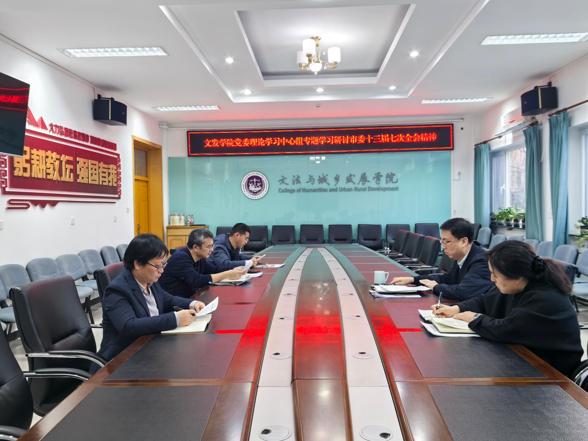 党委理论学习中心组专题学习研讨中共北京市委十三届七次全会精神。中心组成员围绕全会部署与学院实际,集体研究贯彻落实举措。