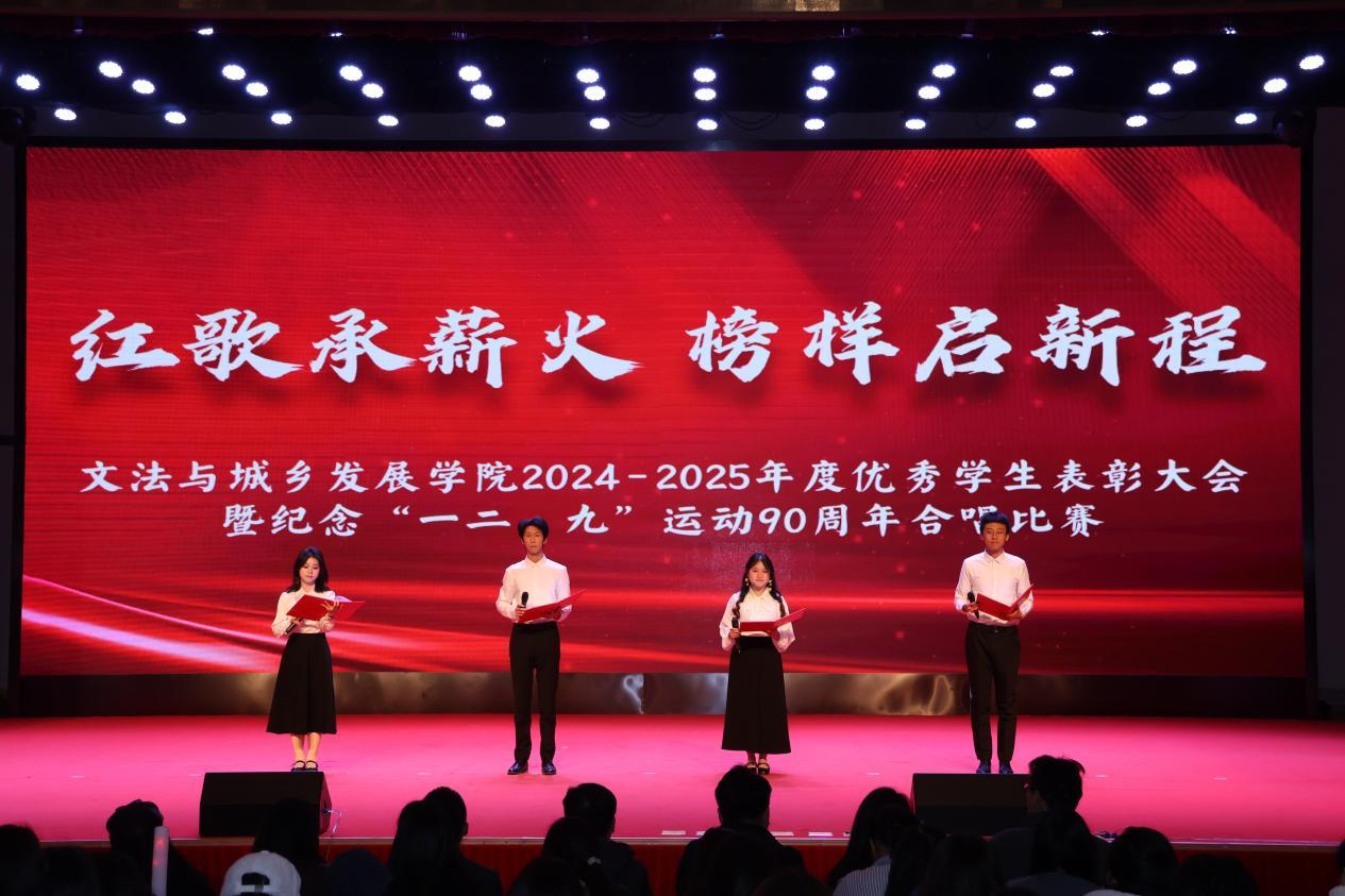 在学校礼堂隆重举办“红歌承薪火,榜样启新程”2024-2025年度优秀学生表彰大会暨纪念“一二·九”运动90周年合唱比赛。学院党委书记赵和文、学生工作负责人周旭平、全体辅导员、获奖学生代表、各年级学生代表及全体大一新生共同参与活动。