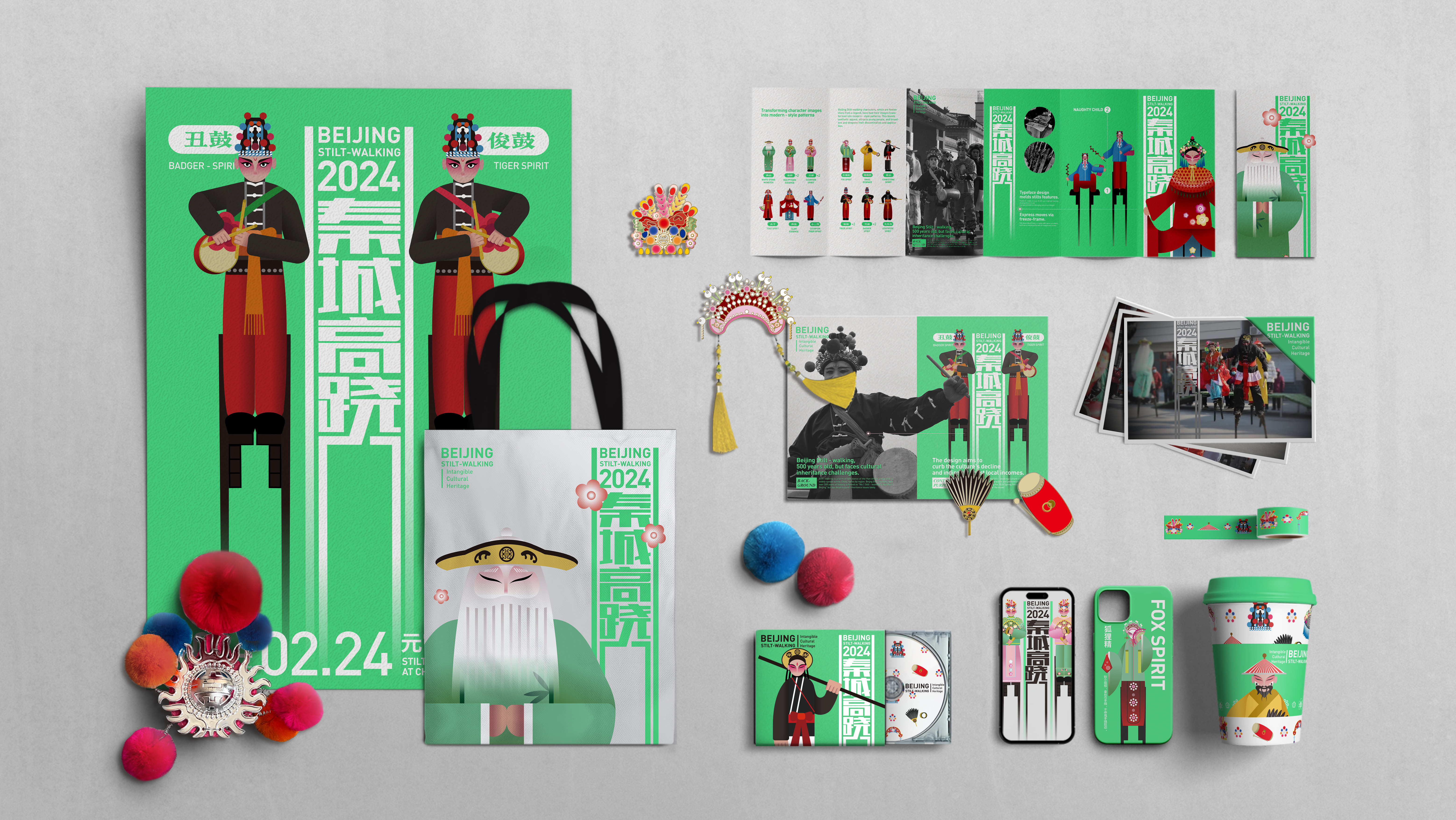 该毕业设计作品以昌平区兴寿镇秦城村的百年高跷传统为设计对象,通过深入挖掘高跷表演的历史渊源、人物形象、服饰道具、技艺特点等核心文化元素,运用信息设计的现代化手段,将难以言传的民俗内涵转化为适配线下展览、数字化传播、文创开发的多元成果。这一设计作品的完成,突破了传统乡村文化传播范式,完成了乡村文化的科普推广,助力了乡村文化的活化创新。