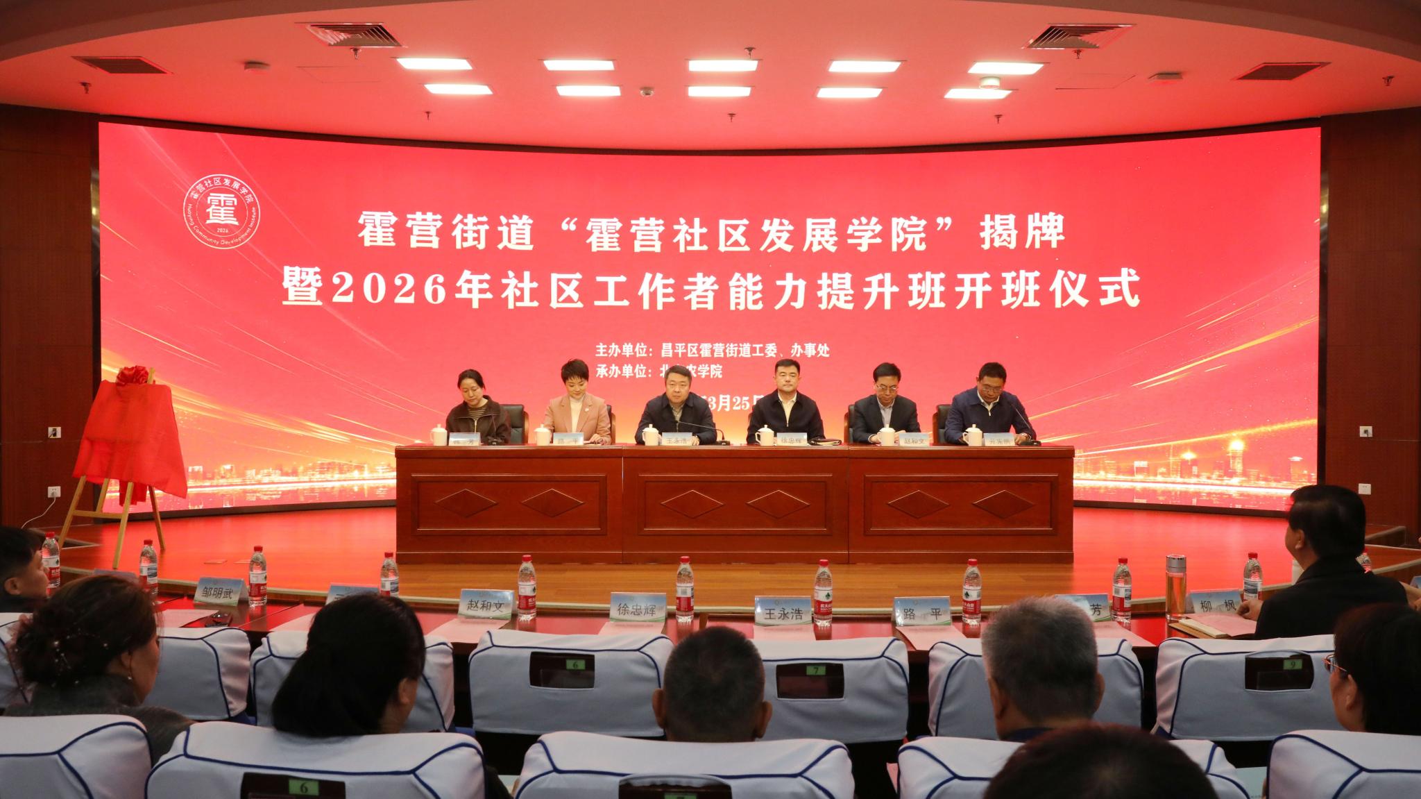 与霍营街道共同主办的“霍营社区发展学院”揭牌仪式暨2026年社区工作者能力提升班开班仪式在北京农学院图书馆报告厅隆重举行。活动设主会场1个、社区线上分会场20个,霍营街道领导班子成员、学院相关领导、街道科级干部及全体社区工作者共计200余人参加。北京农学院党委常委、副校长王永浩、社会服务处处长路平及相关领导参加活动。
